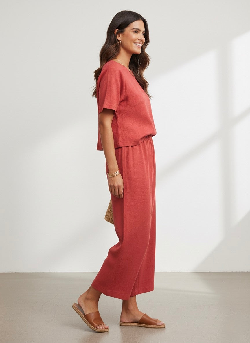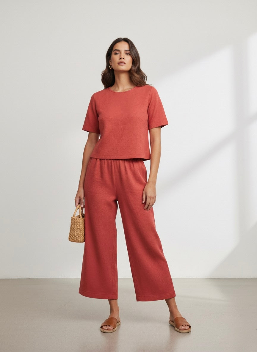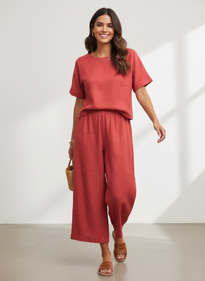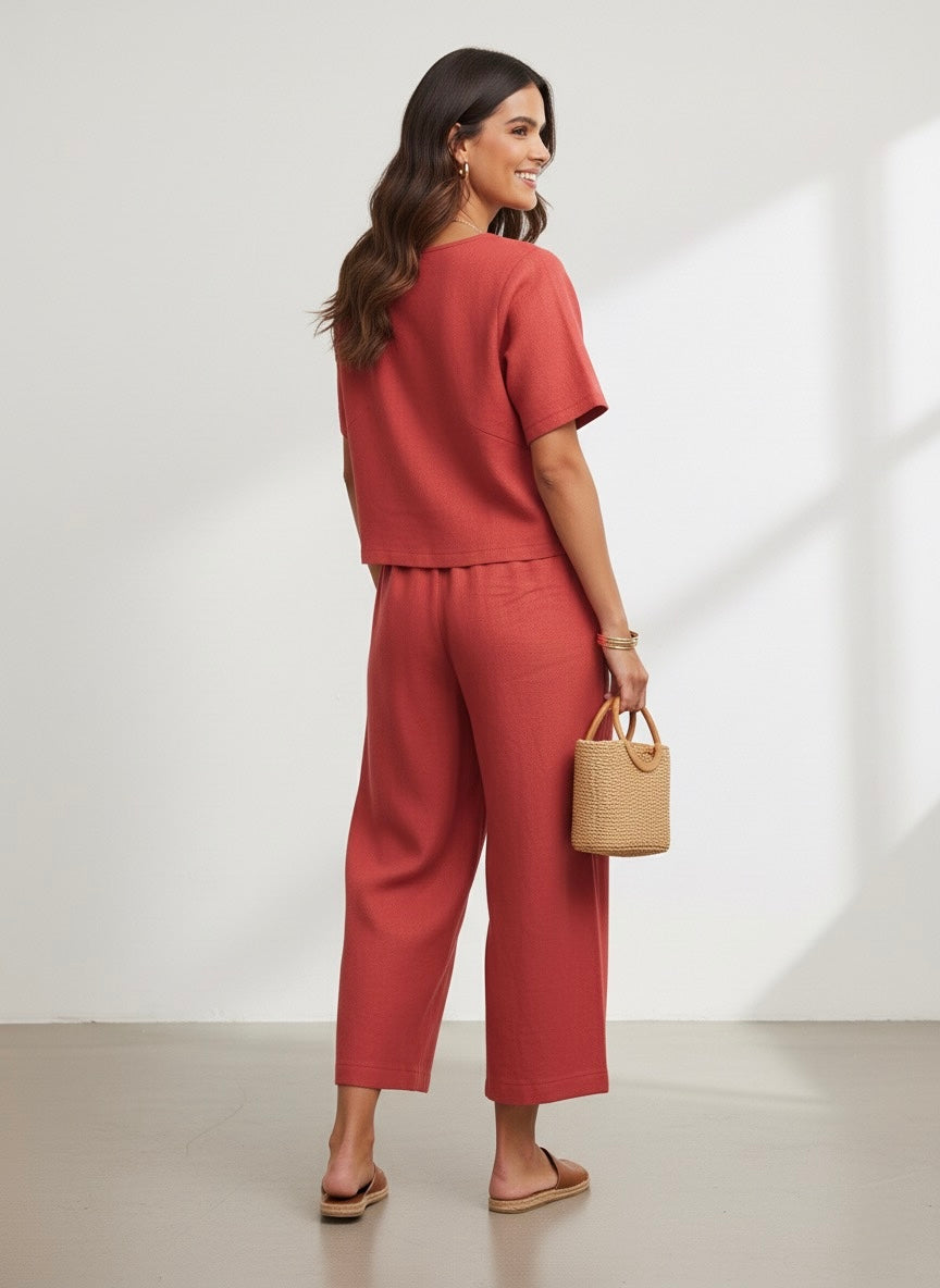 Descubre la esencia del estilo sin esfuerzo con nuestro Carmín Urbano. Comodidad y elegancia, este conjunto de 2 piezas incluye una blusa de manga corta y cuello redondo que cae con gracia, combinada con palazzo de corte ancho.
