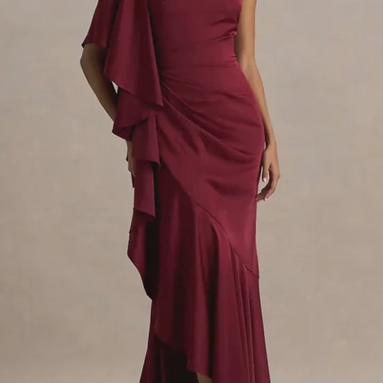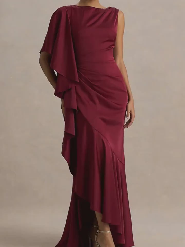 Elegancia Borgoña es un vestido largo de silueta estilizada con diseño asimétrico de un solo hombro y caída fluida que envuelve el cuerpo con sofisticación absoluta. Su tono borgoña profundo transmite lujo y seguridad, ideal para eventos formales, galas y ocasiones donde la elegancia es imprescindible.