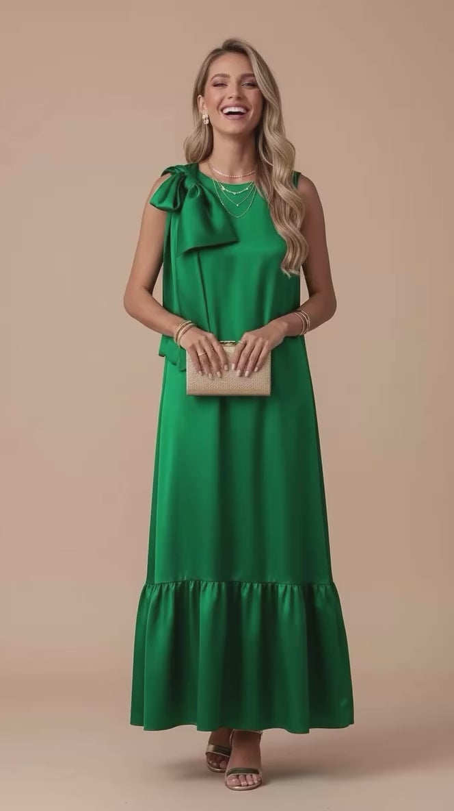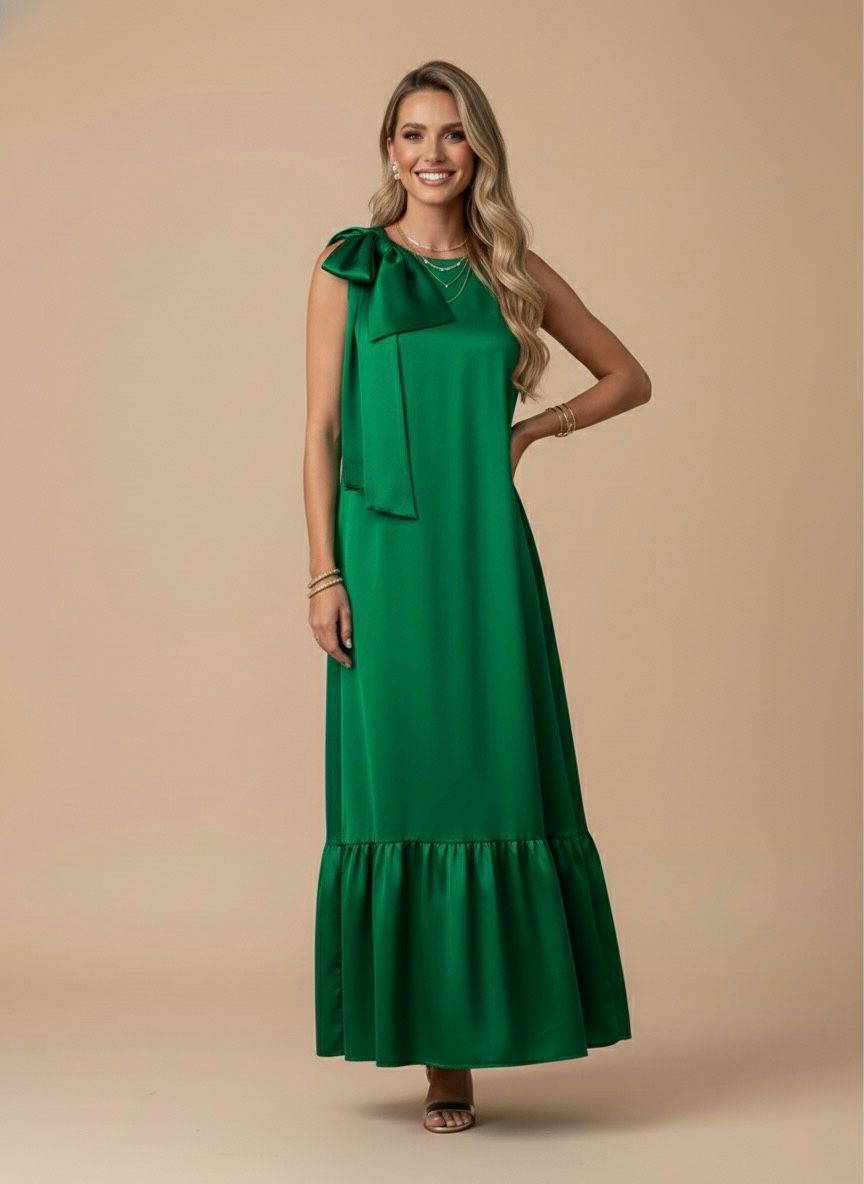 Un vestido largo en tono verde esmeralda que fluye con elegancia y sofisticación. Su silueta delicada y el detalle del lazo en el hombro lo convierten en una pieza atemporal, perfecta para destacar con gracia en cualquier ocasión especial.