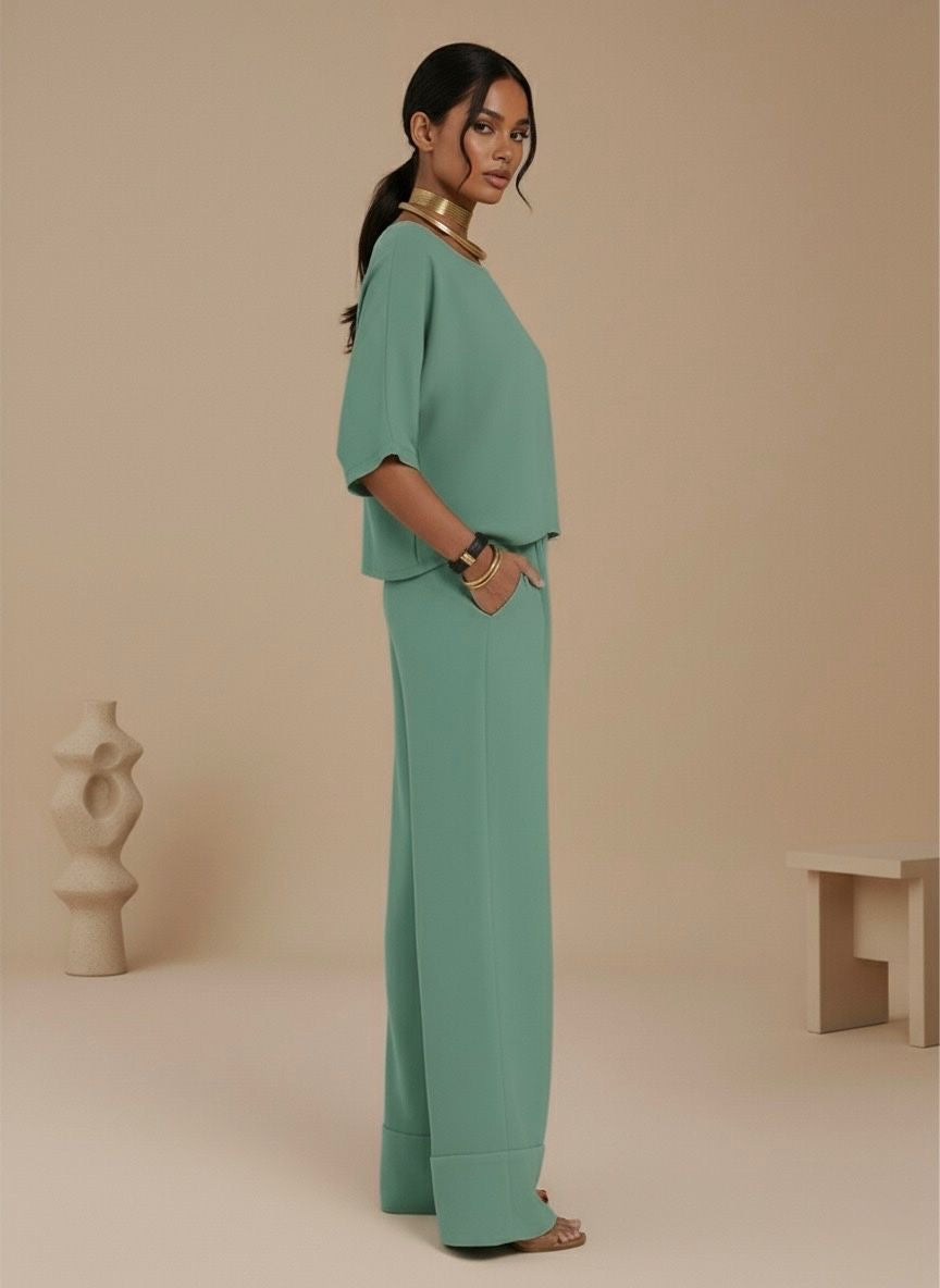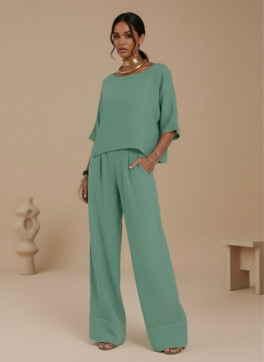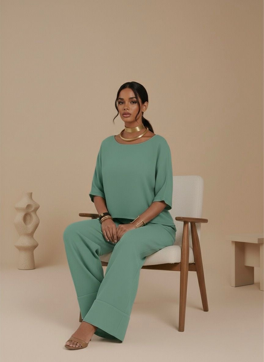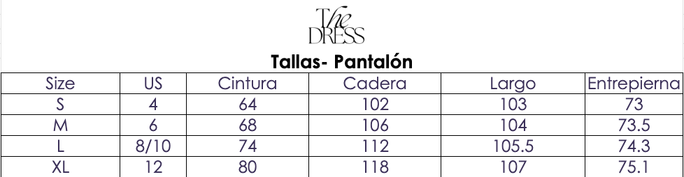 1 Blusa: cuello barco con mangas amplias tres cuartos y corte box-fit para máxima libertad de movimiento.1 Pantalón: estilo palazzo de pierna ancha y tiro alto que estiliza la figura, con prácticos bolsillos laterales y un dobladillo ancho para un acabado refinado.