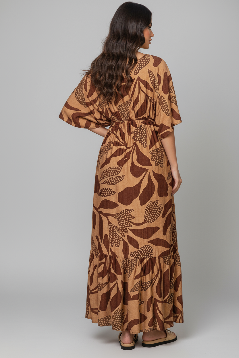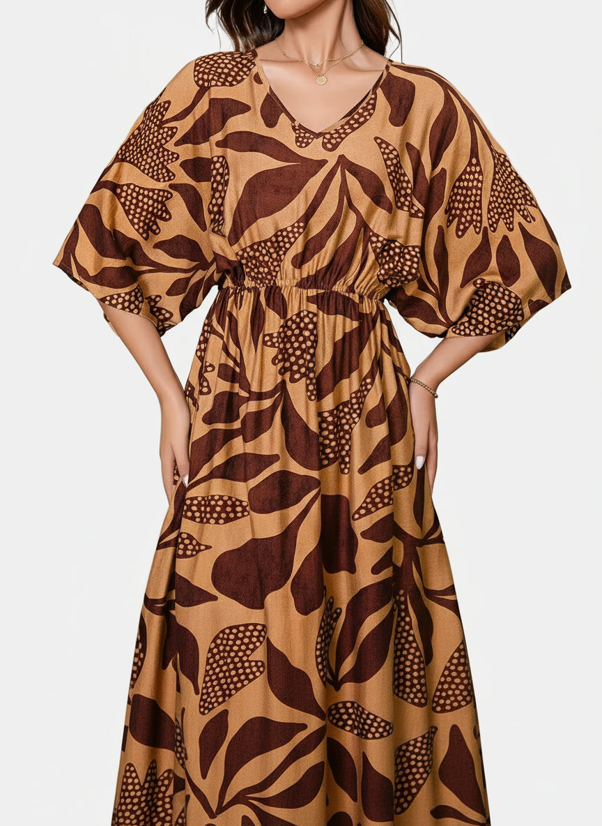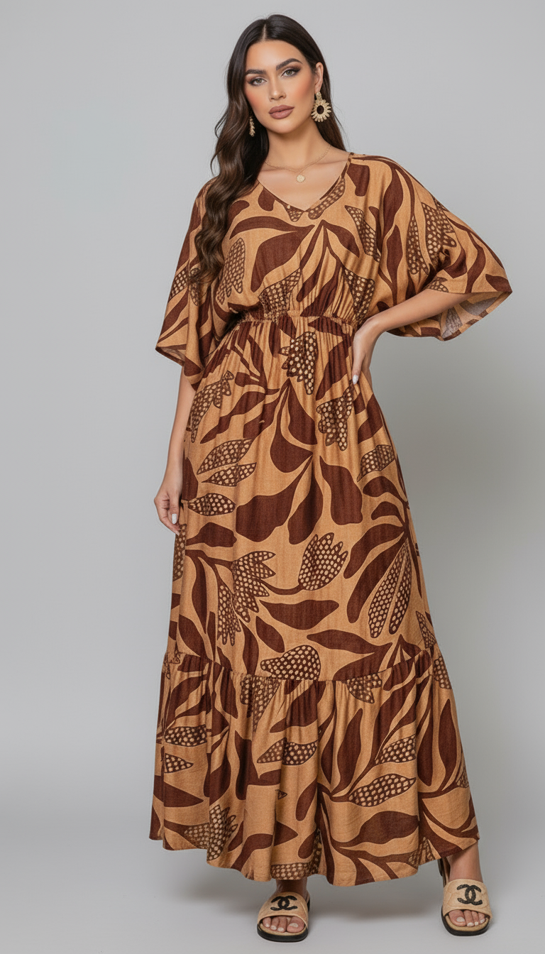 Combina elegancia natural y confort atemporal. Su escote en V y mangas murciélago crean una silueta fluida, mientras la cintura elástica realza la figura con sutileza. Con un estampado floral en tonos marrón y beige, es perfecto para ocasiones formales o momentos casuales con estilo. Ideal para mujeres que buscan sofisticación sin esfuerzo.