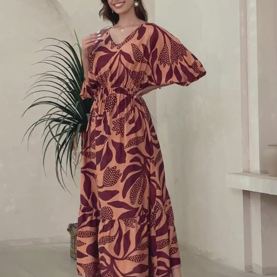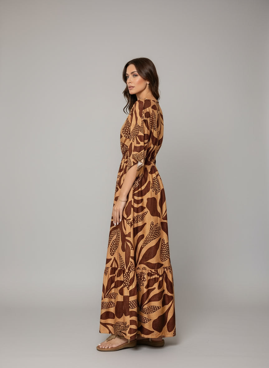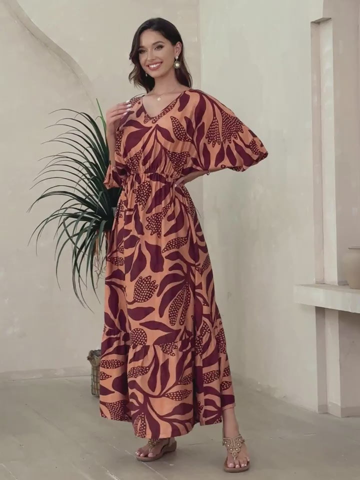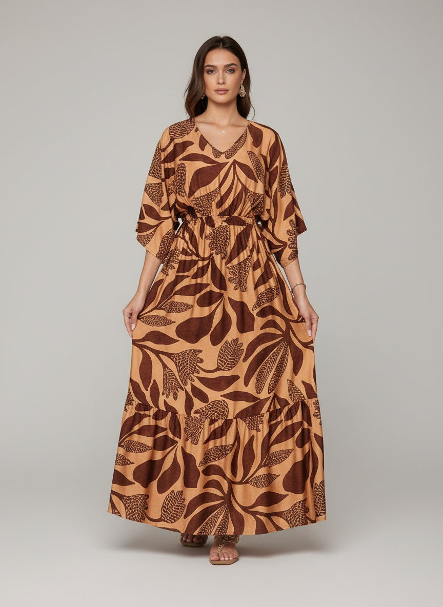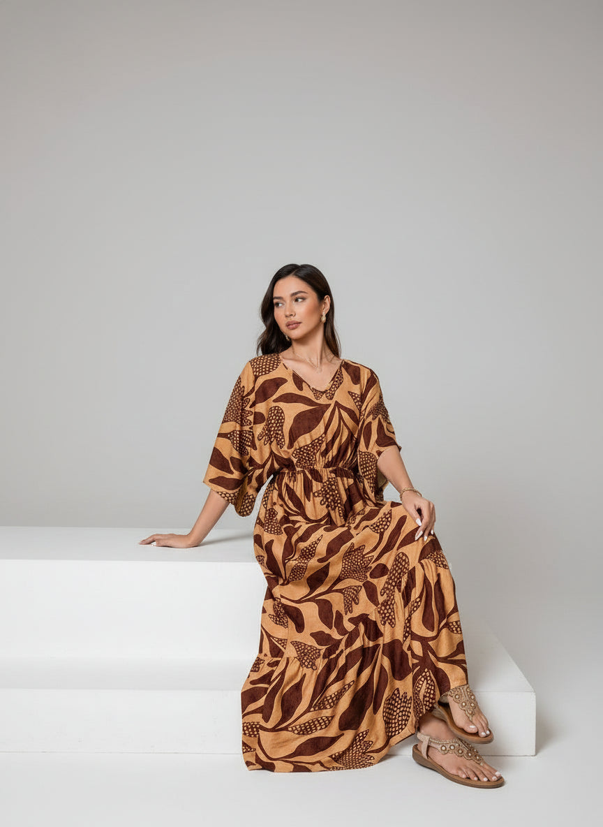 Combina elegancia natural y confort atemporal. Su escote en V y mangas murciélago crean una silueta fluida, mientras la cintura elástica realza la figura con sutileza. Con un estampado floral en tonos marrón y beige, es perfecto para ocasiones formales o momentos casuales con estilo. Ideal para mujeres que buscan sofisticación sin esfuerzo.