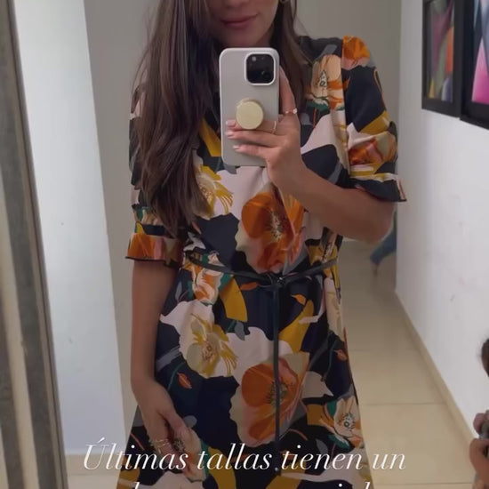Vestido de manga 3/4 abullonada con estampado floral, vestido informal con cuello de muesca para primavera y verano.