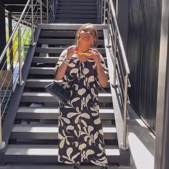 El Vestido Etérea irradia elegancia natural con su diseño sin tirantes y mangas con su caída fluida tipo A. Su estampado de hojas sobre fondo blanco aporta un aire fresco y sofisticado, ideal para bodas, fiestas o noches de verano. Confeccionado en un tejido suave y lavable a máquina, combina lujo y comodidad en una sola pieza que resalta tu feminidad con gracia y ligereza.